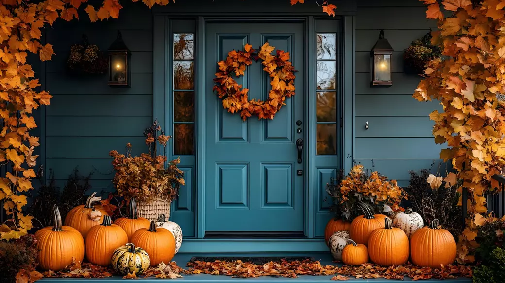 Simple, elegant displays: A few white pumpkins, decorative lanterns, and neatly arranged foliage along your walkway create an inviting entrance without going overboard.